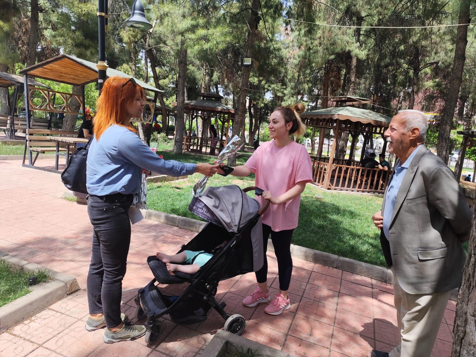 Etkinlik kapsamında, Mardin Eğitim ve Araştırma Hastanesi’nde görev yapan sağlık personeli ve yeni doğum yapan Annelere ziyaretler gerçekleştirildi. Aynı zamanda kent merkezinde de Annelere karanfil ve badem şekeri hediye edilerek Anneler Günü’nün anlam ve önemine dikkat çekildi.